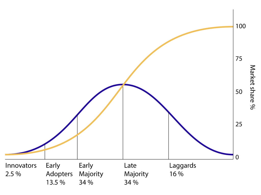 The blue line represents segments of consumers adopting your new technology, and your market share is represented by the yellow line.